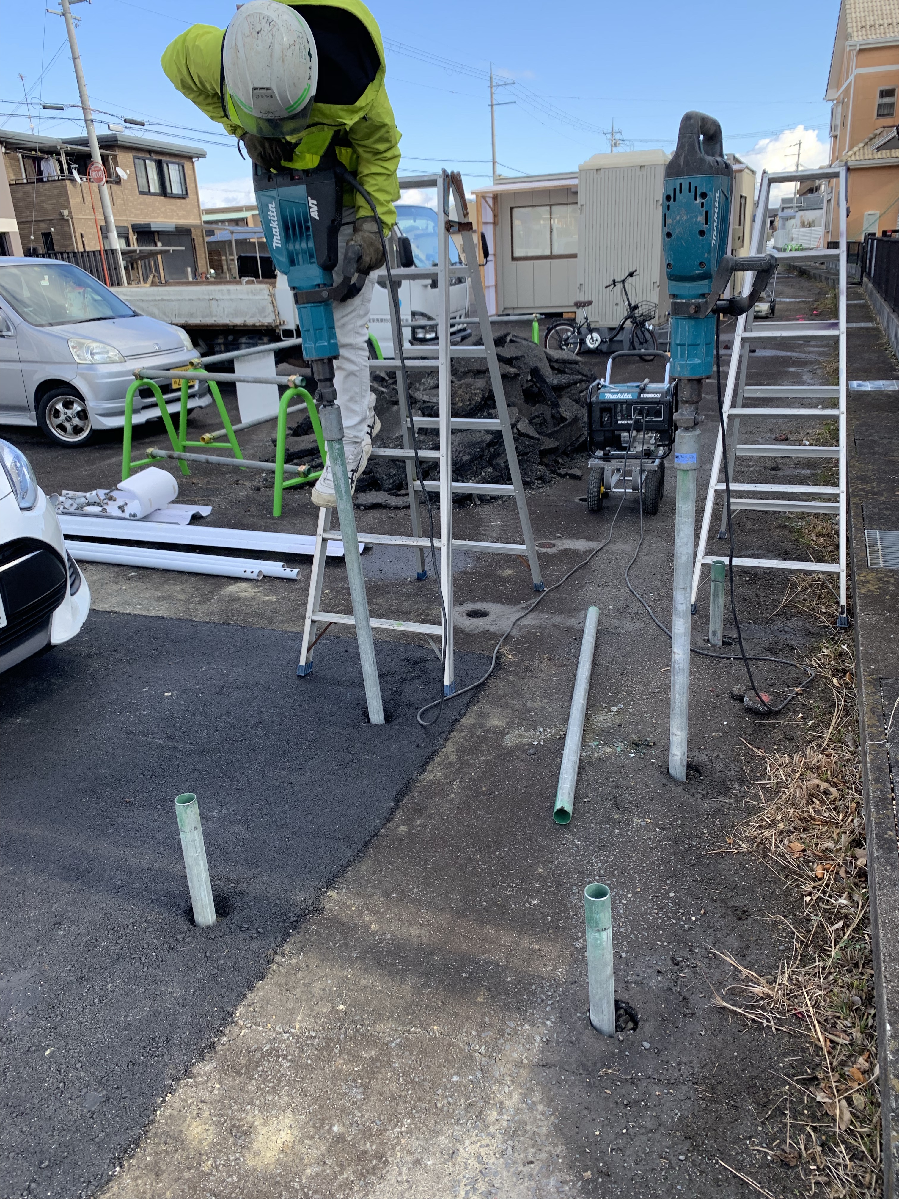 この現場では発電機と2台の杭打ち機をフル稼働して1000本以上の杭を打ち込んでおります。